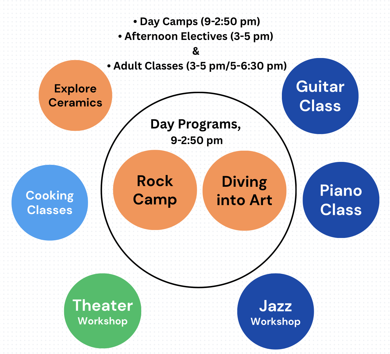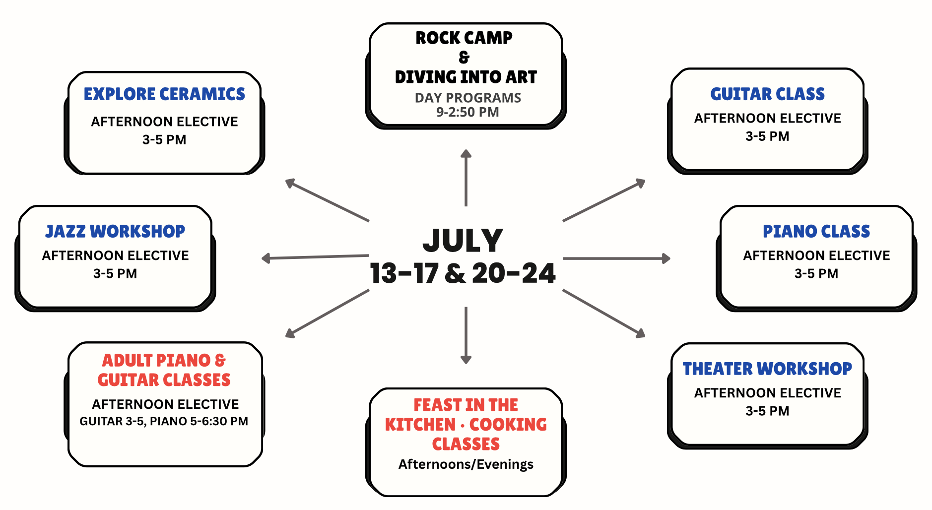 Rock Camp | Jazz Workshop | Diving Into Art | Theater Workshop | Explore Ceramics | Feast in the Kitchen (Culinary Classes)